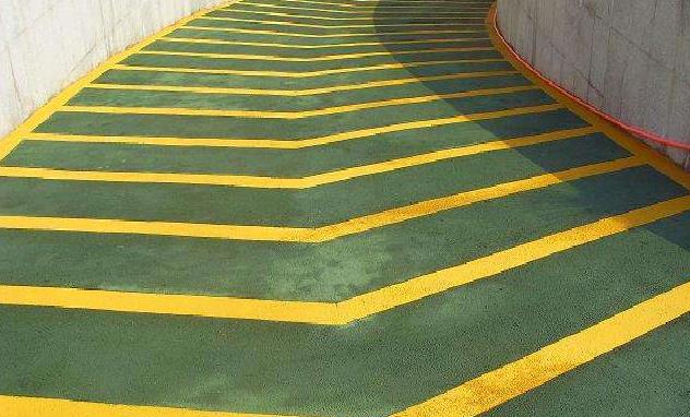 在底涂干燥之后,進行批刮止滑抗壓層,而在絕大多數的坡道止滑地坪工程施工中,抗壓層用的大都是黃色的止滑抗壓材料,而這一層將會有部分裸露出來,進而作為坡道線一部分。