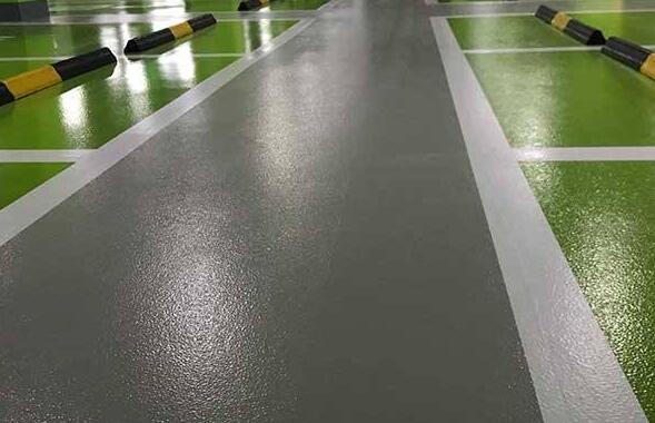 (五)耐磨罩面面漆:依照正確比例將主劑、固化劑及骨料攪拌均勻,用滾筒均勻輥涂于地面,完工后地面顏色均勻,無氣泡,無空鼓,啞光效果,停車場可以有效的消除輪胎摩擦噪音,有麻面質(zhì)感效果且耐磨效果達(dá)到6H。