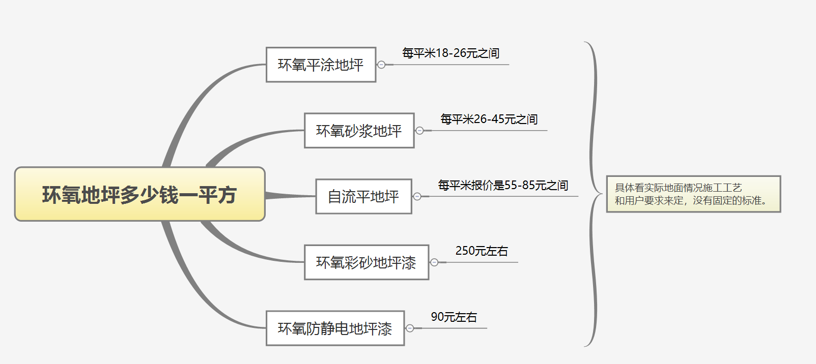 環(huán)氧平涂地坪包工包料每平米18-26元之間;環(huán)氧砂漿地坪包工包料每平米26-45元之間;自流平地坪每平米報價是55-85元之間;環(huán)氧彩砂地坪漆250元左右;環(huán)氧防靜電地坪漆90元左右,具體看實際地面情況施工工藝和用戶要求來定,沒有固定的標準。