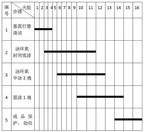 施工面積為5000平方米,配備現場管理人員4人,施工工人員12人,正常情況下需要16天完成此工程。